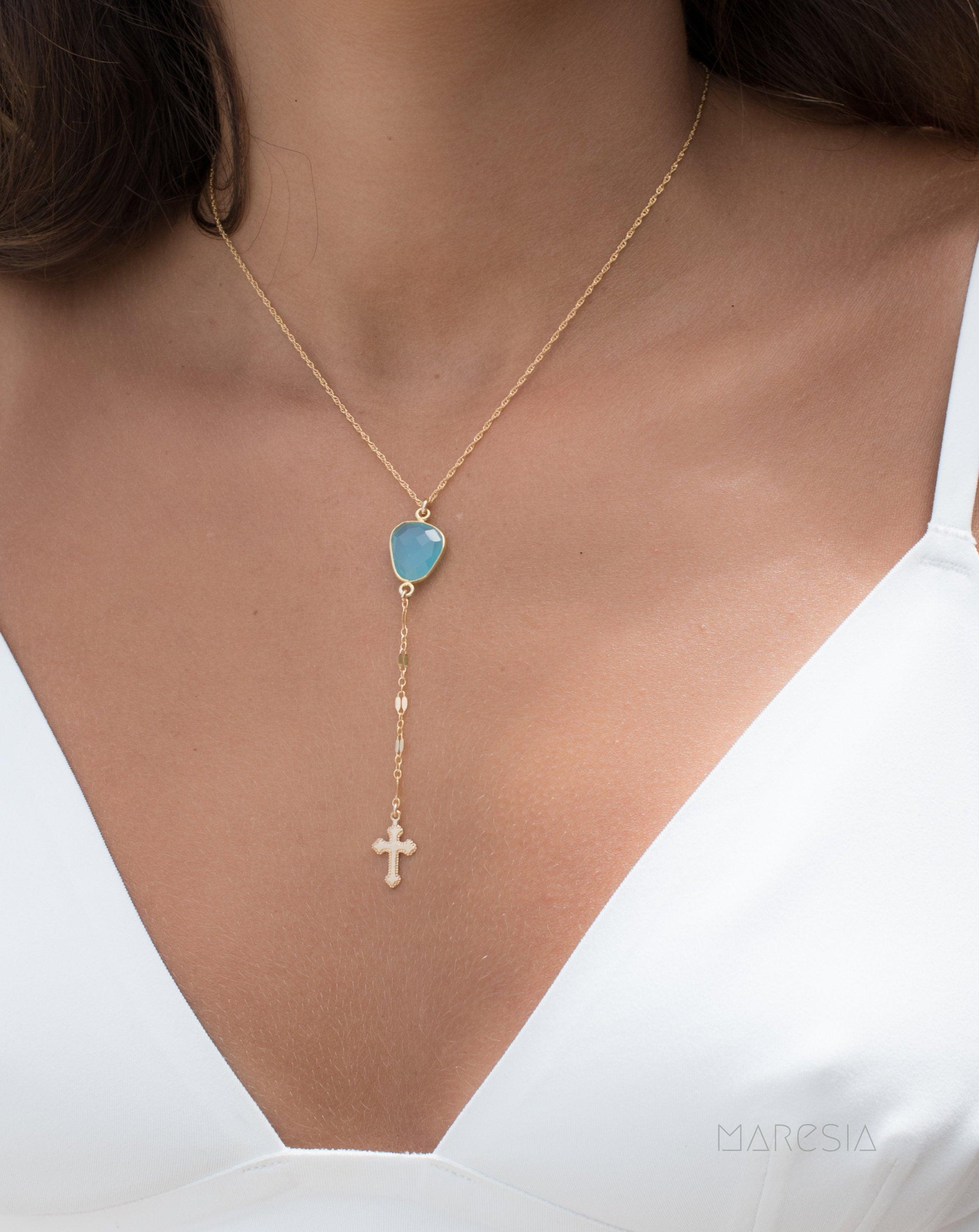 Y necklace Blue Chalcedony Cross ~ Gold Filled ~MN019 - Maresia Jewelry