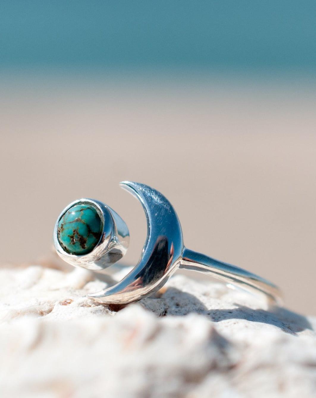 The moon is ruler of many things in our lives. Its different cycles influence our emotions & intuitions. For that reason we appreciate this ring as an accessory that represent one of the most beautiful transitions of the moon: THE HALF MOON! We mix up the Turquoise with copper to better symbolize the earth and the influences of the moon on us.