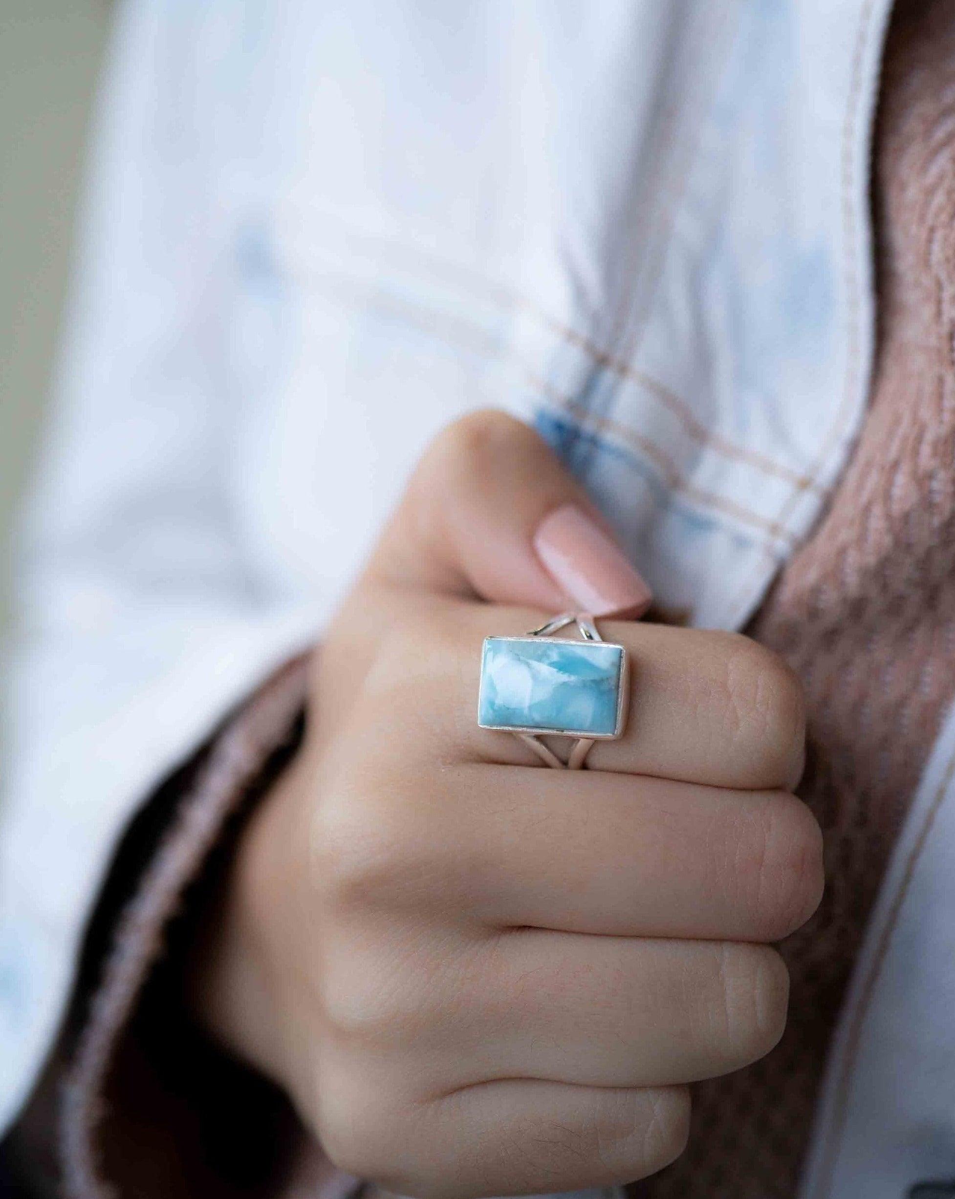 Larimar Ring ~ Statement ~ Gemstone ~ Semi Precious Stone ~ Blue ~ White ~ Natural~Organic~Sterling Silver 925~Rectangular ~Thin Band~ MR293