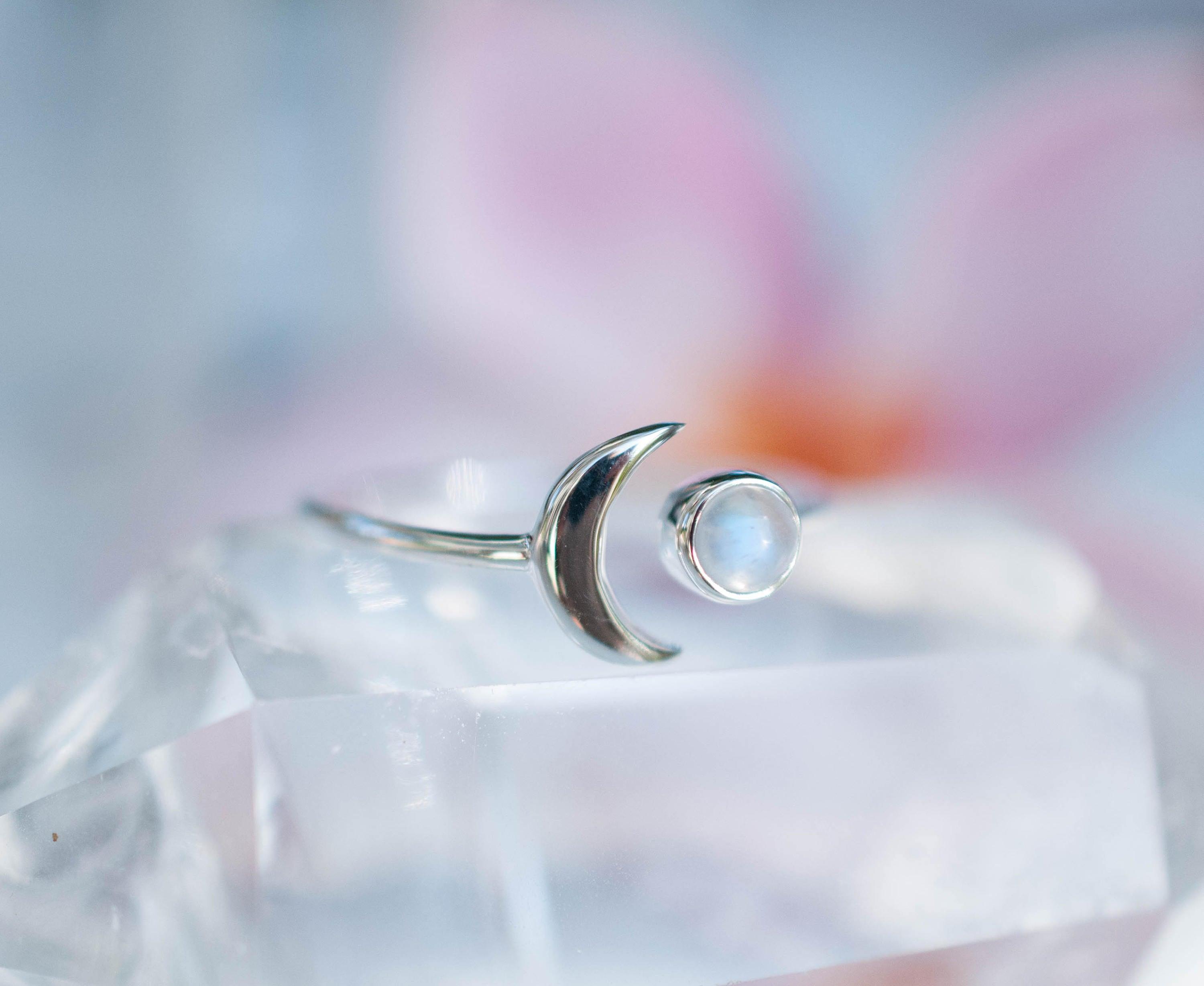 The moon is ruler of many things in our lives. Its different cycles influence our emotions & intuitions. For that reason we appreciate this ring as an accessory that represent one of the most beautiful transitions of the moon: THE HALF MOON! The rainbow Moonstone represents the brightness of the sun and how it perfectly creates the four different cycles of the moon!