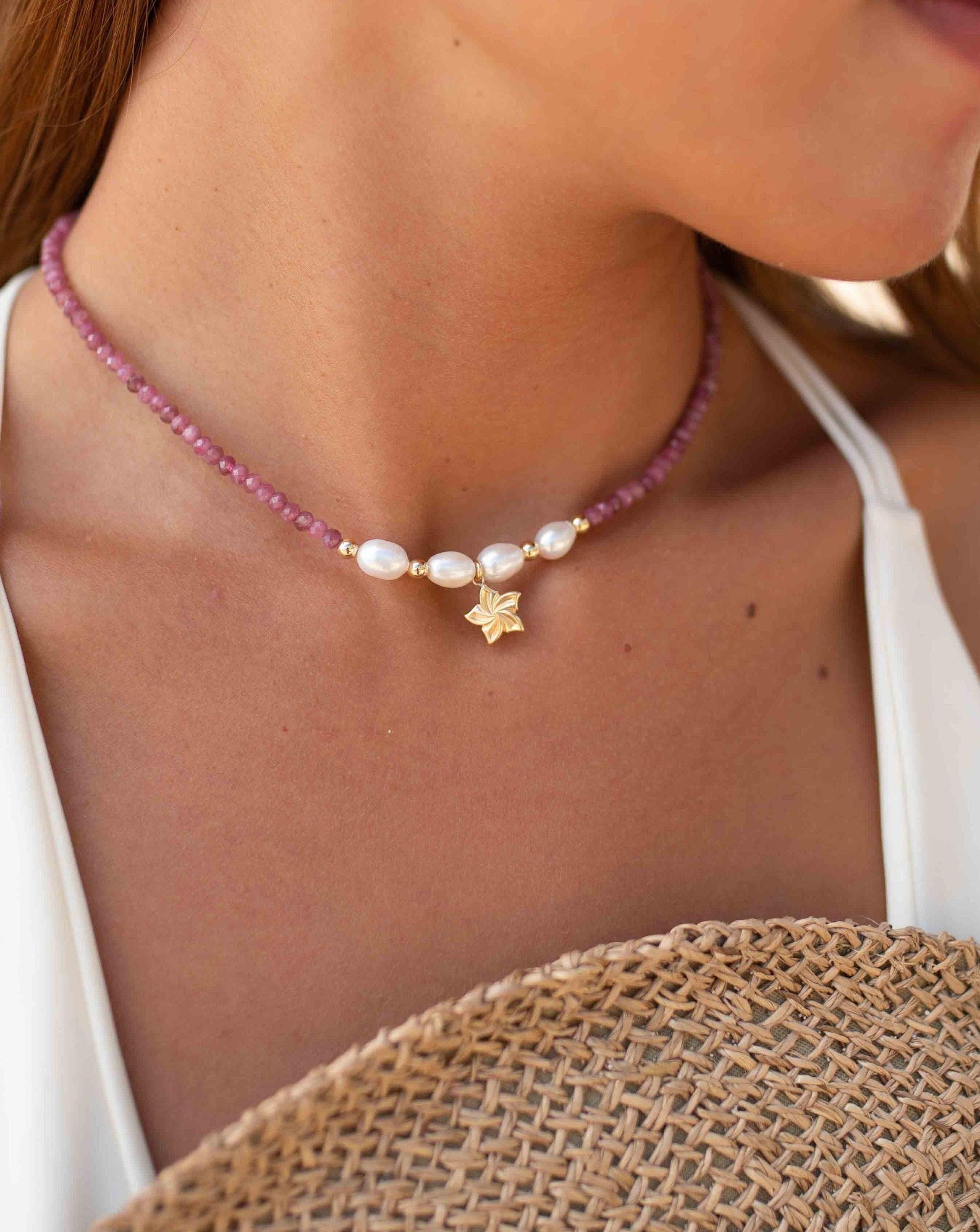 Pink Tourmaline and Pearl necklace~ Gold Filled Flower ~ Choker ~ Jewelry ~ Gift For Her ~ Minimalist~ Handmade MN099